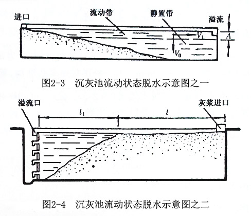 灰水流動(dòng)狀態(tài)的脫水是灰水由沉灰池的一端進(jìn)入,澄清水由另一端溢流排出的連續(xù)作業(yè),灰粒在灰水流中邊流動(dòng)邊沉降。在沉灰池中灰水分為兩帶,上層灰水流動(dòng)部分稱(chēng)為流動(dòng)帶,下層靜止沉降積灰部分稱(chēng)為靜置帶(圖2-3和圖2-4)。沉灰池中粗、重顆粒,由于水力沉速快,穿過(guò)運(yùn)動(dòng)帶的時(shí)間很短,被灰水流攜帶向溢流口移動(dòng)的距離也很短,故在沉灰池進(jìn)口處快速沉降,而形成一個(gè)坡向溢流口的斜面。灰水不斷引進(jìn),澄清水溢流,斜面積灰層逐漸增高,待溢流水中含灰量超過(guò)允許限度(<0.1)時(shí)就關(guān)閉灰水進(jìn)口閘門(mén),再靜置一段時(shí)間后,入出澄清水就可以挖灰使用。