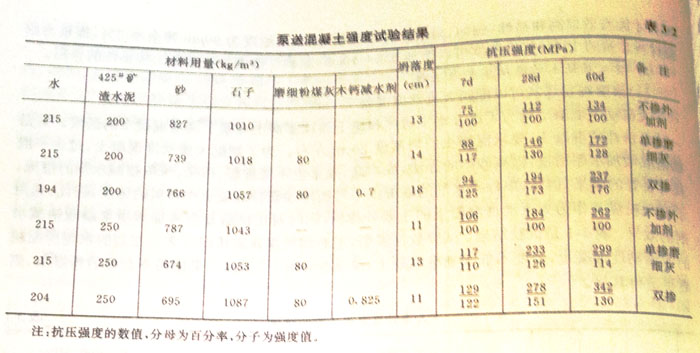 可泵性主要決定于混凝土與管壁之間的摩擦力。由于低標(biāo)號(hào)混凝土的水泥用量少,可泵性差,因此,過去規(guī)定C15以下的混凝土不得泵送??墒菗饺绶勖夯液蜏p水機(jī)劑后,可使混凝土在不增加水泥的情況下仍能獲得良好的可泵性。在寶電工程中,C2.5、C5和C15的混凝土在300m水平硬管輸送時(shí)也沒有發(fā)生堵塞現(xiàn)在。表3—3是低標(biāo)號(hào)粉煤灰泵送混凝土的施工實(shí)例。